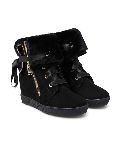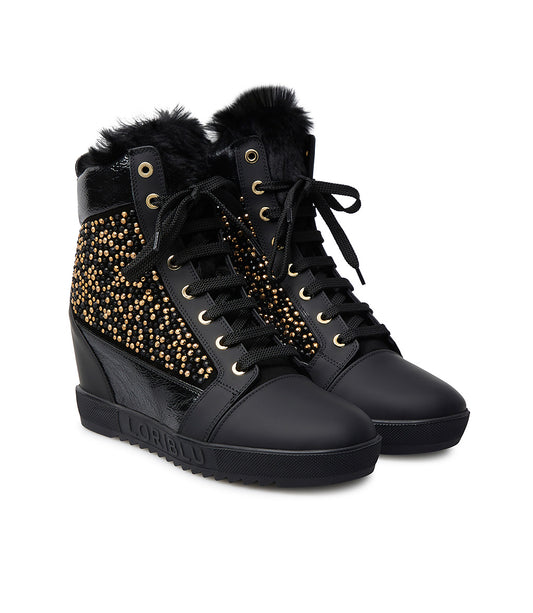 Scarpa in camoscio nero con risvolto in eco pelliccia