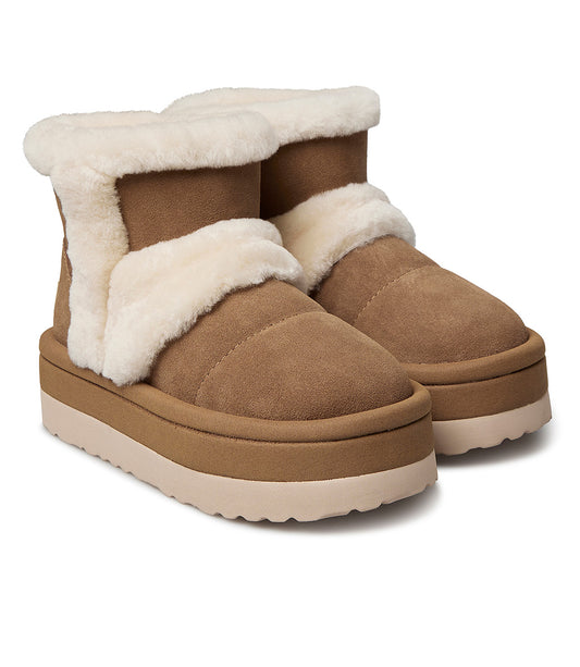 Scarpa in camoscio beige con risvolto in eco pelliccia e platform