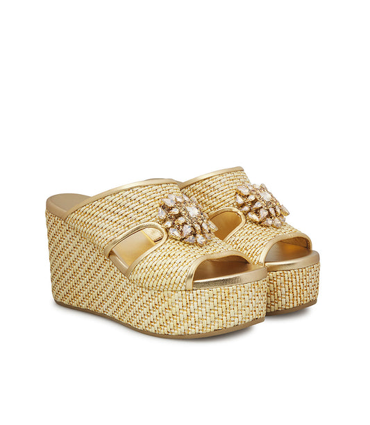 Sandalo zeppa in raffia e vernice oro con gioiello