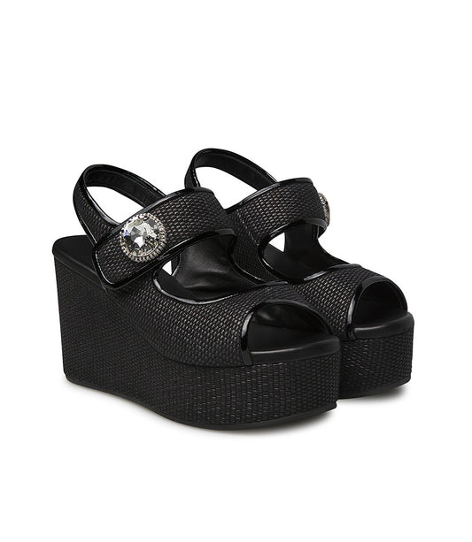 Sandalo zeppa in nappa e rafia nero con gioiello