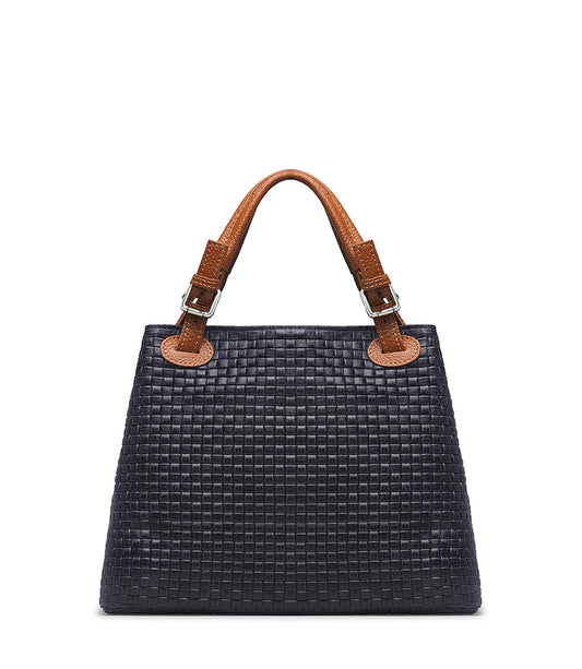 Borsa a mano in rafia blu notte e nappa cuoio
