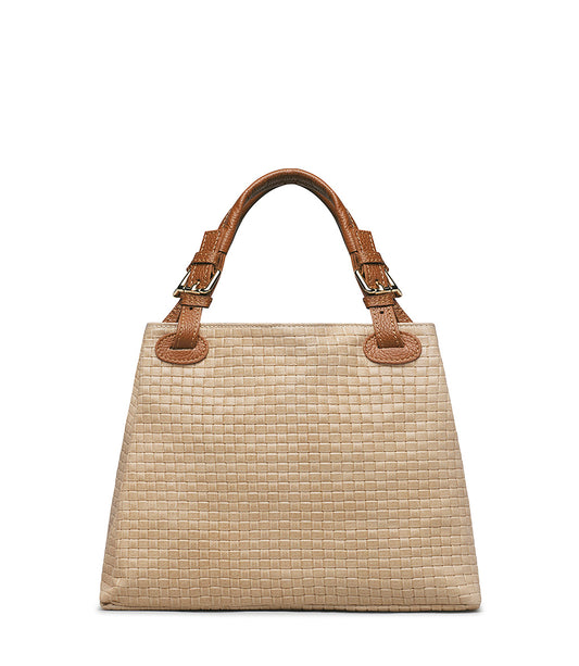 Borsa a mano in rafia beige e nappa cuoio