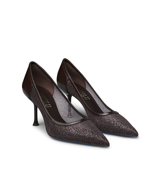 Décolleté in vernice e tricot marrone