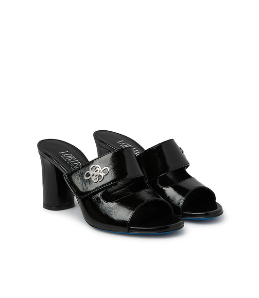 Mule in pelle lucida nera con logo metal