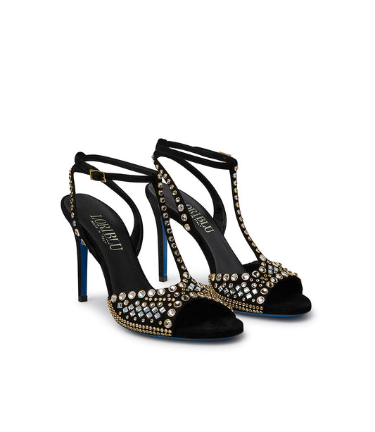Sandalo gioiello in camoscio nero con cristalli