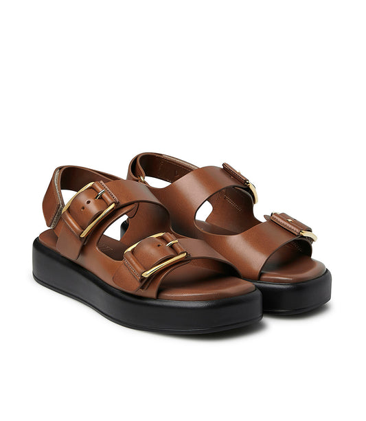 Sandali in pelle cuoio con fasce frontali e maxi fibbie in metallo oro