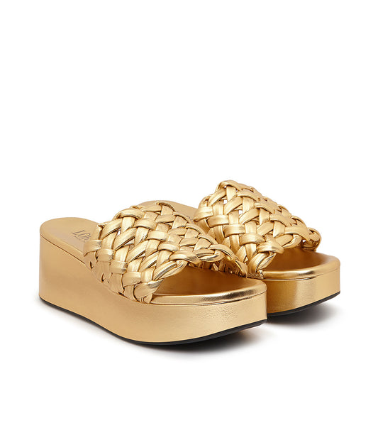 Mules zeppa in nappa intrecciata oro