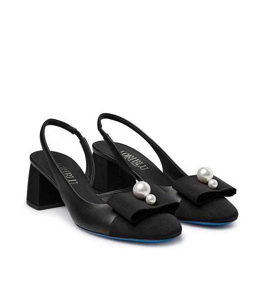Slingback in tessuto e nappa nero con perle