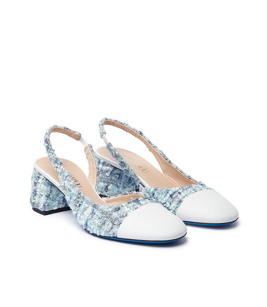 Slingback in nappa bianca e tessuto tweed celeste