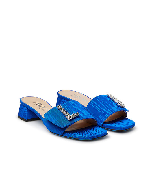 Mules in moiré bluette con decorazione gioiello