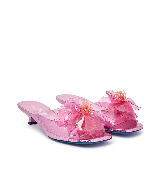 Mules in nappa blu tiffany con fiore in plexi