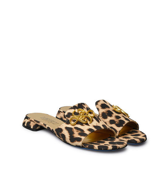 Mules in tessuto stampa leopard con logo metal gold