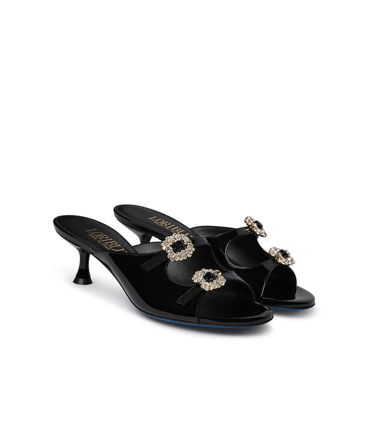 Mules in vernice nera con fibbie gioiello