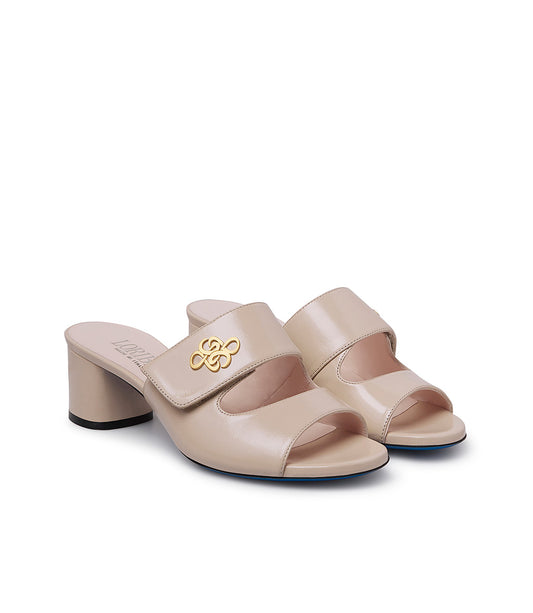 Mules in pelle lucida sabbia con logo metal gold