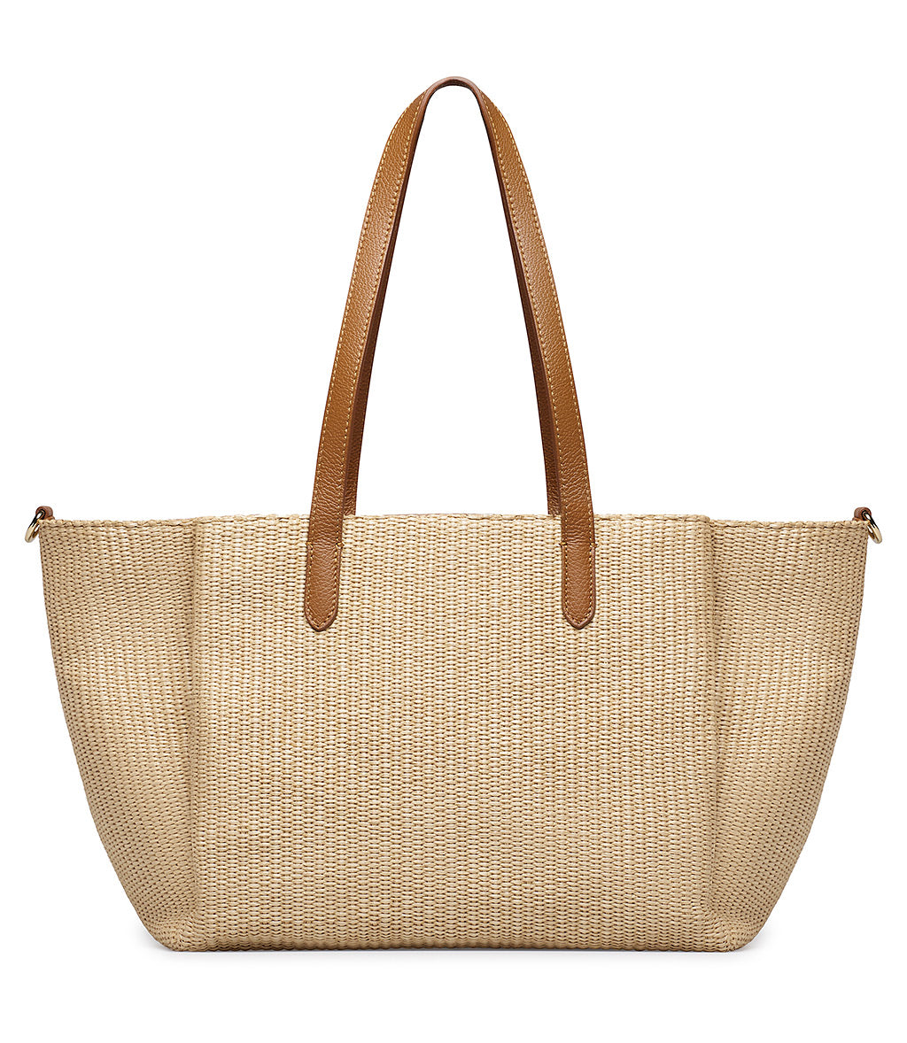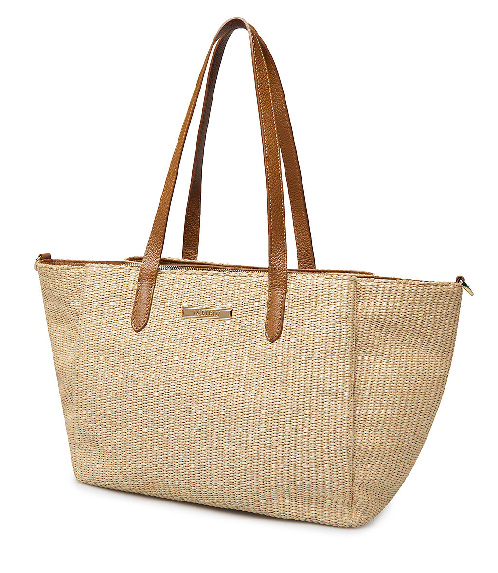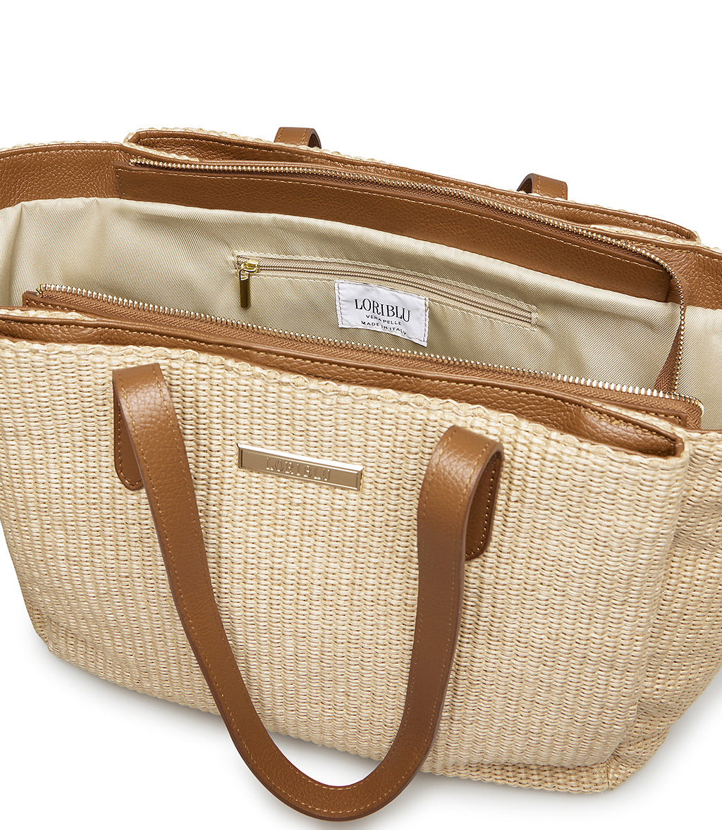 Borsa shopper a spalla in rafia naturale e pelle cuoio