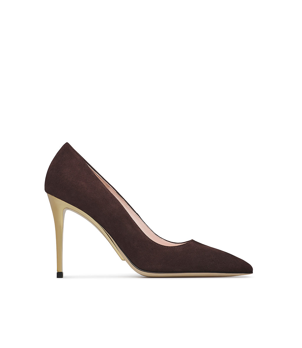 Realizzate in Italia, le nostre décolleté sono eleganti, femminili e senza tempo. Presentano una silhouette in pregiato camoscio moro, spiccano grazie al tacco scultura in metallo dorato ed alla silhouette raffinata. Punta sfilata e suola in cuoio naturale, è l'accessorio perfetto da abbinare ai tuoi outfit eleganti.