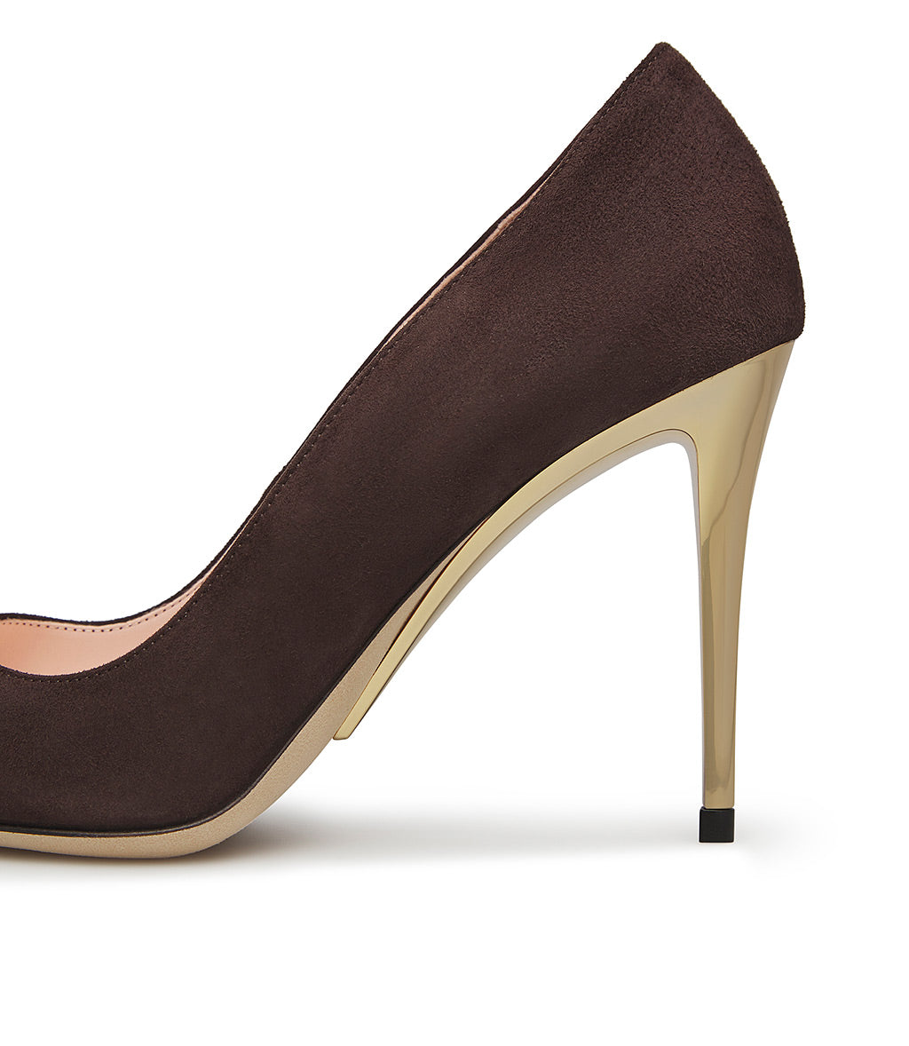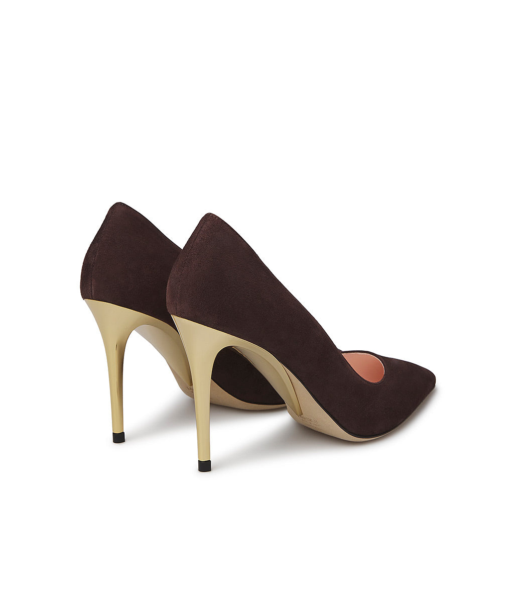 Décolleté in camoscio moro con tacco scultura in metallo oro