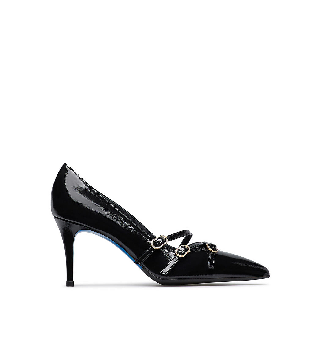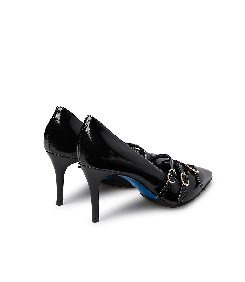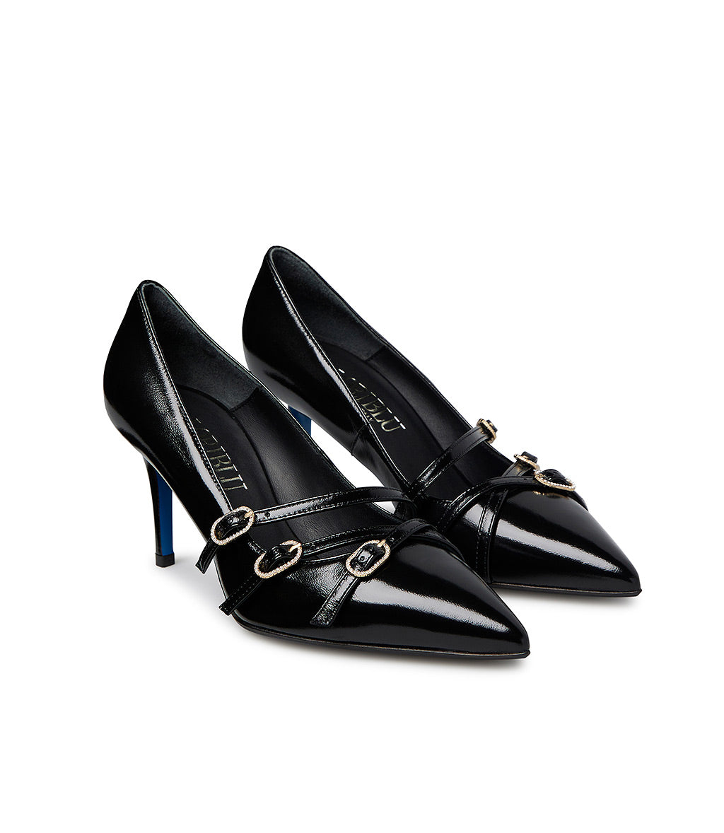Décolleté in pelle lucida nero con cinturini