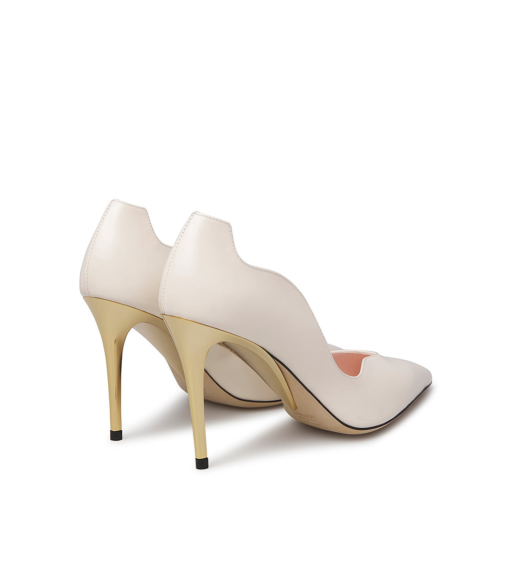Dècolletè in vernice latte con tacco scultura in metallo oro