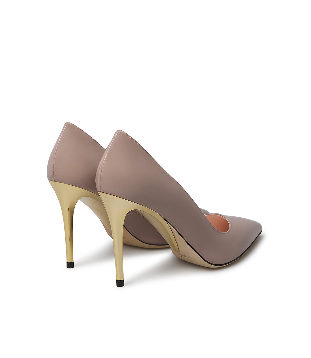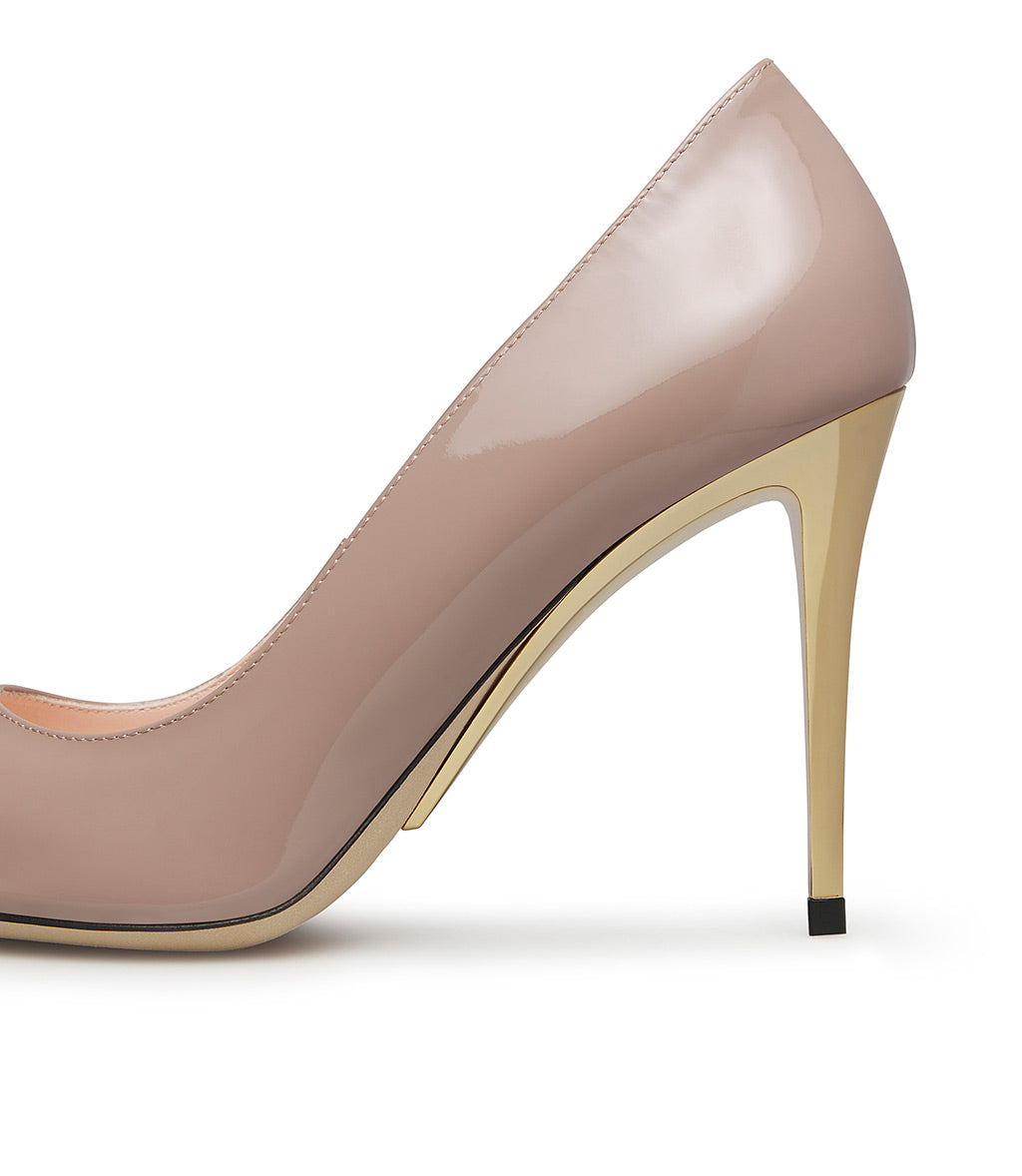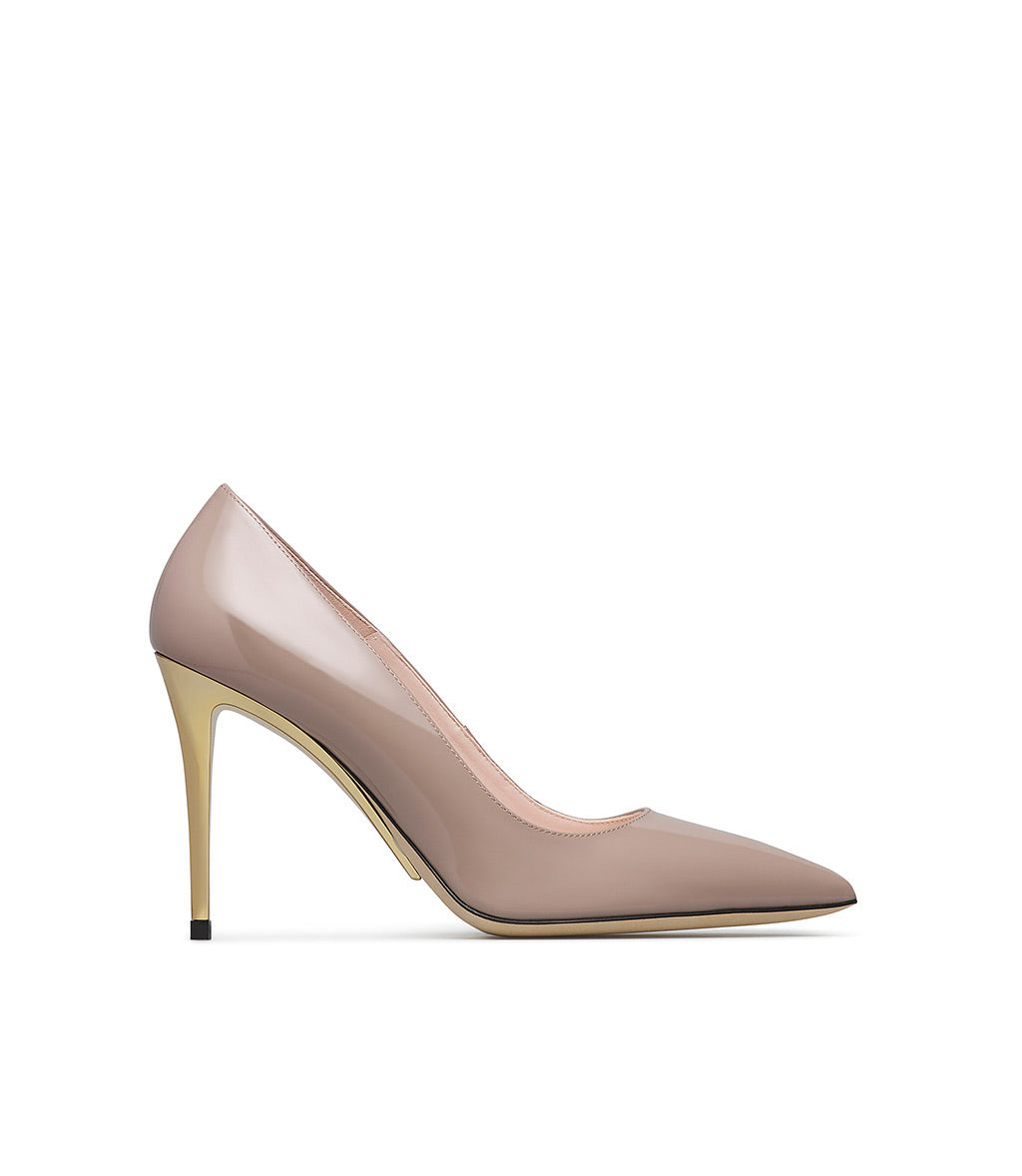 Dècolletè in vernice mandorla con tacco scultura in metallo oro