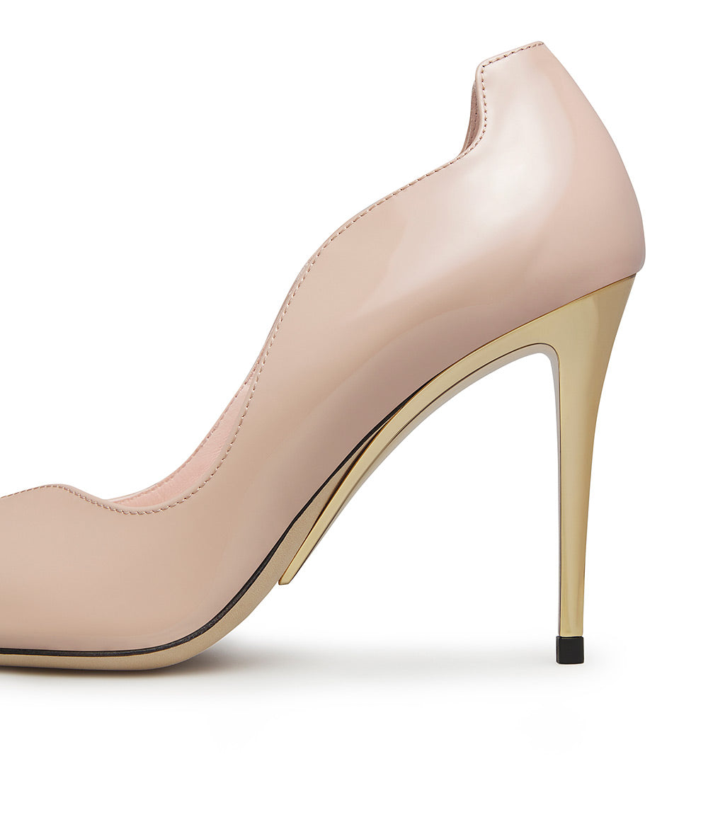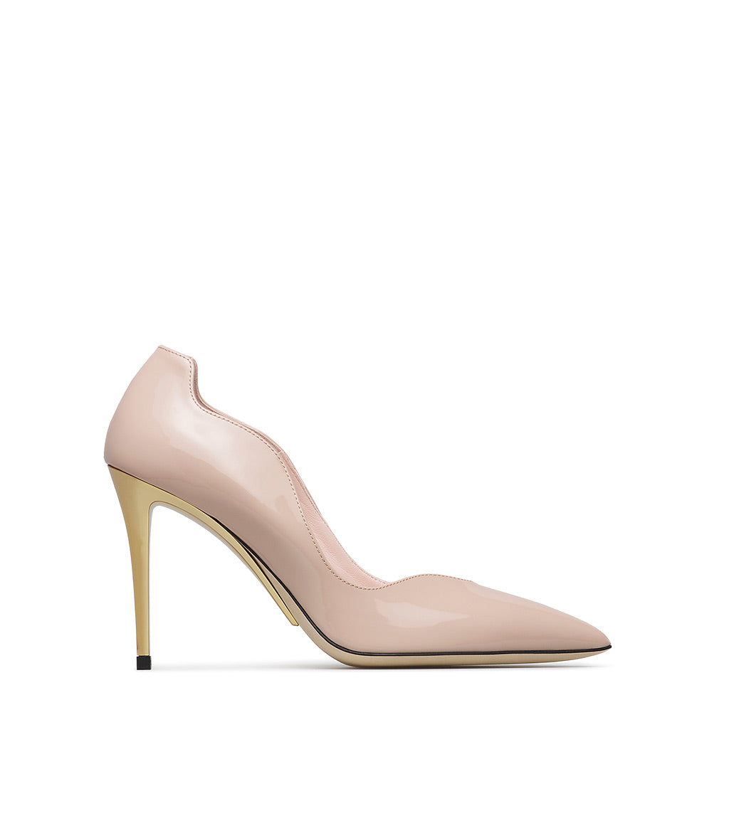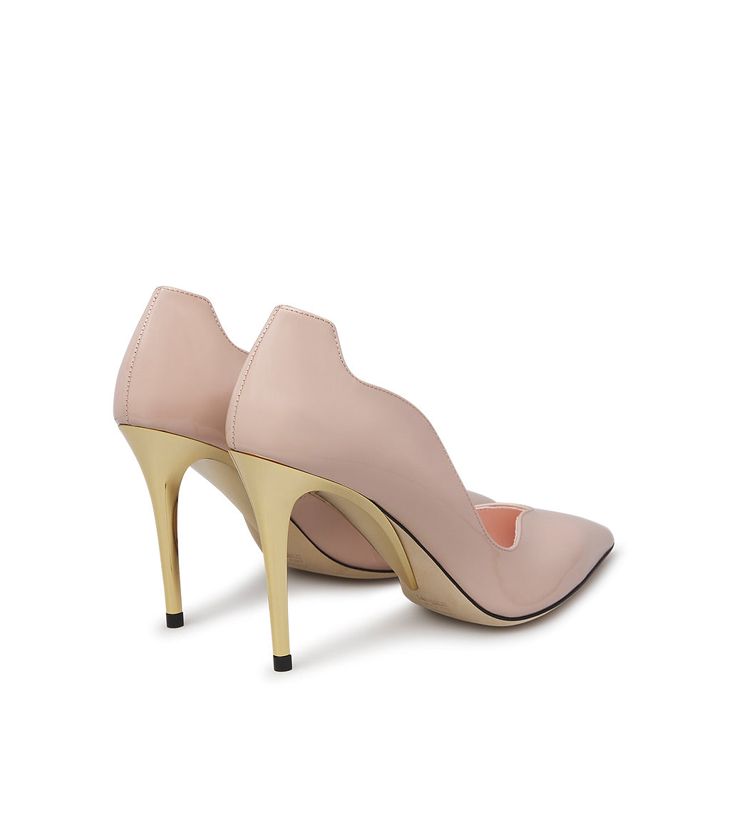 Décolletè in vernice nude con tacco scultura in metallo oro