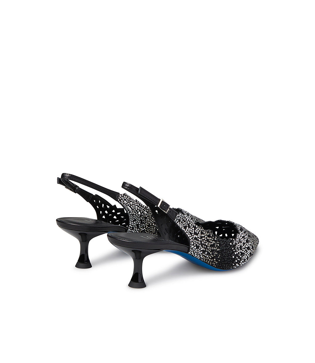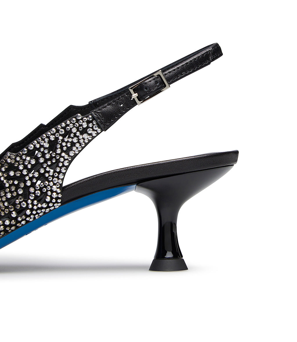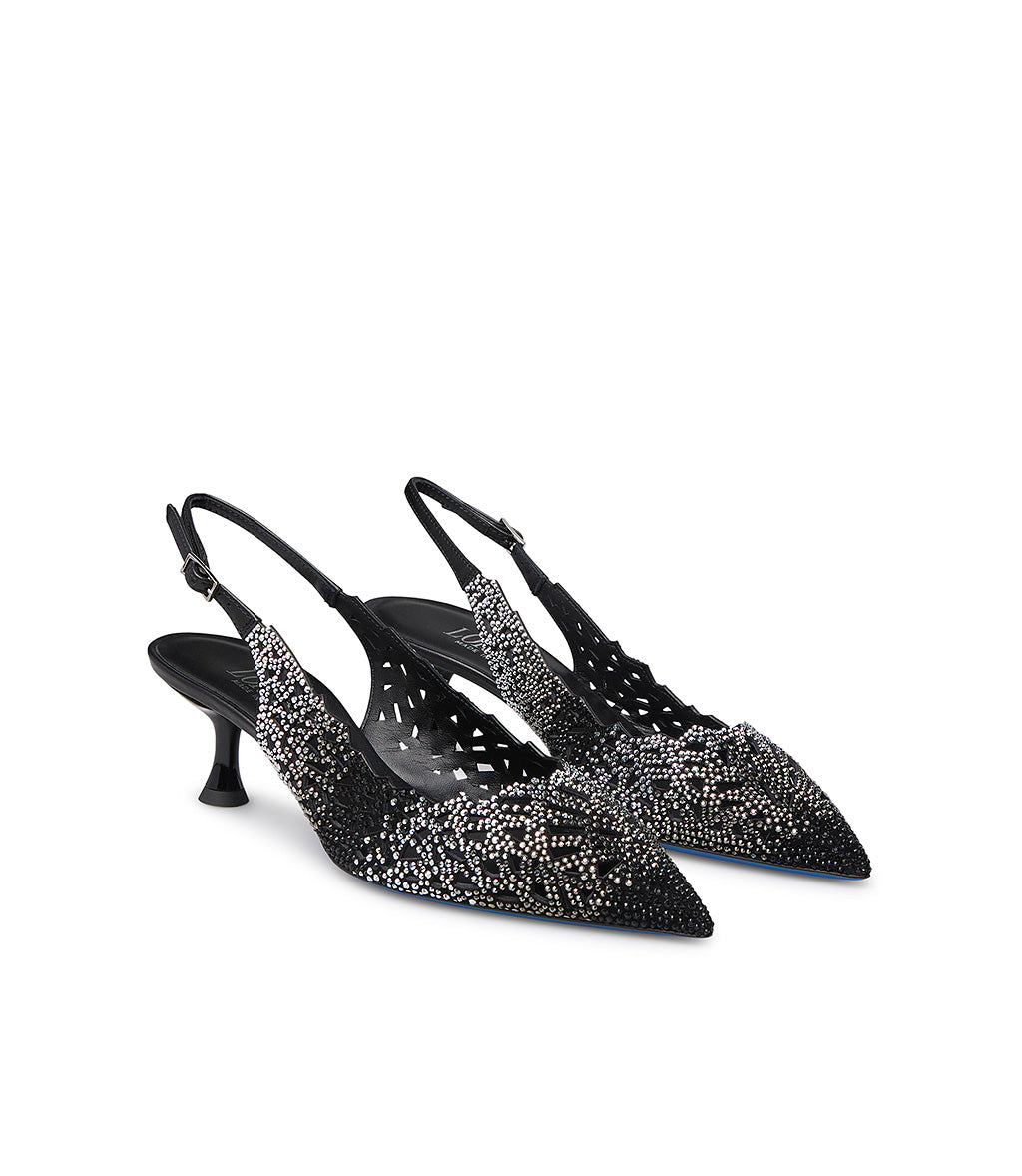 Slingback in camoscio nero laser-cut con cristalli decorativi